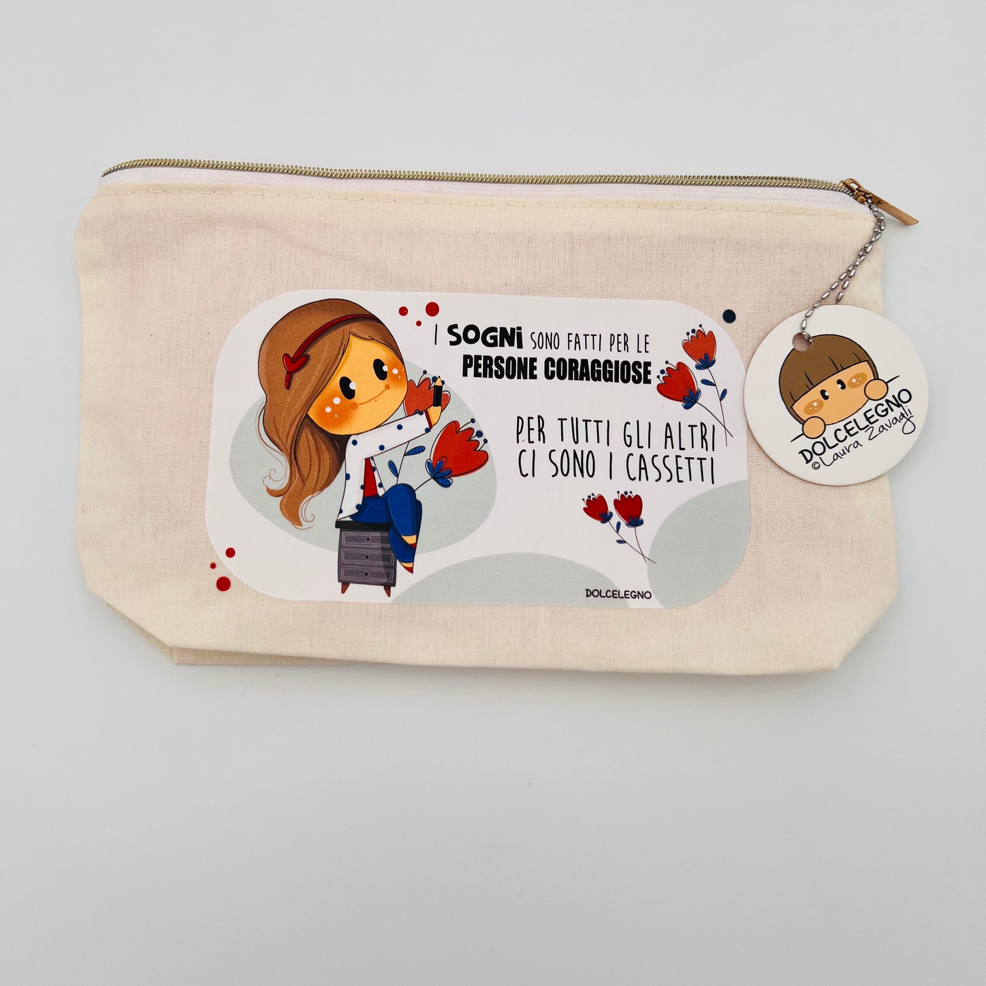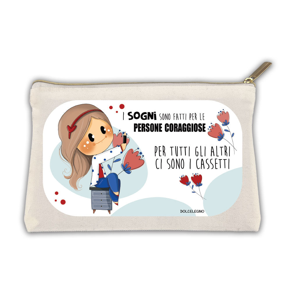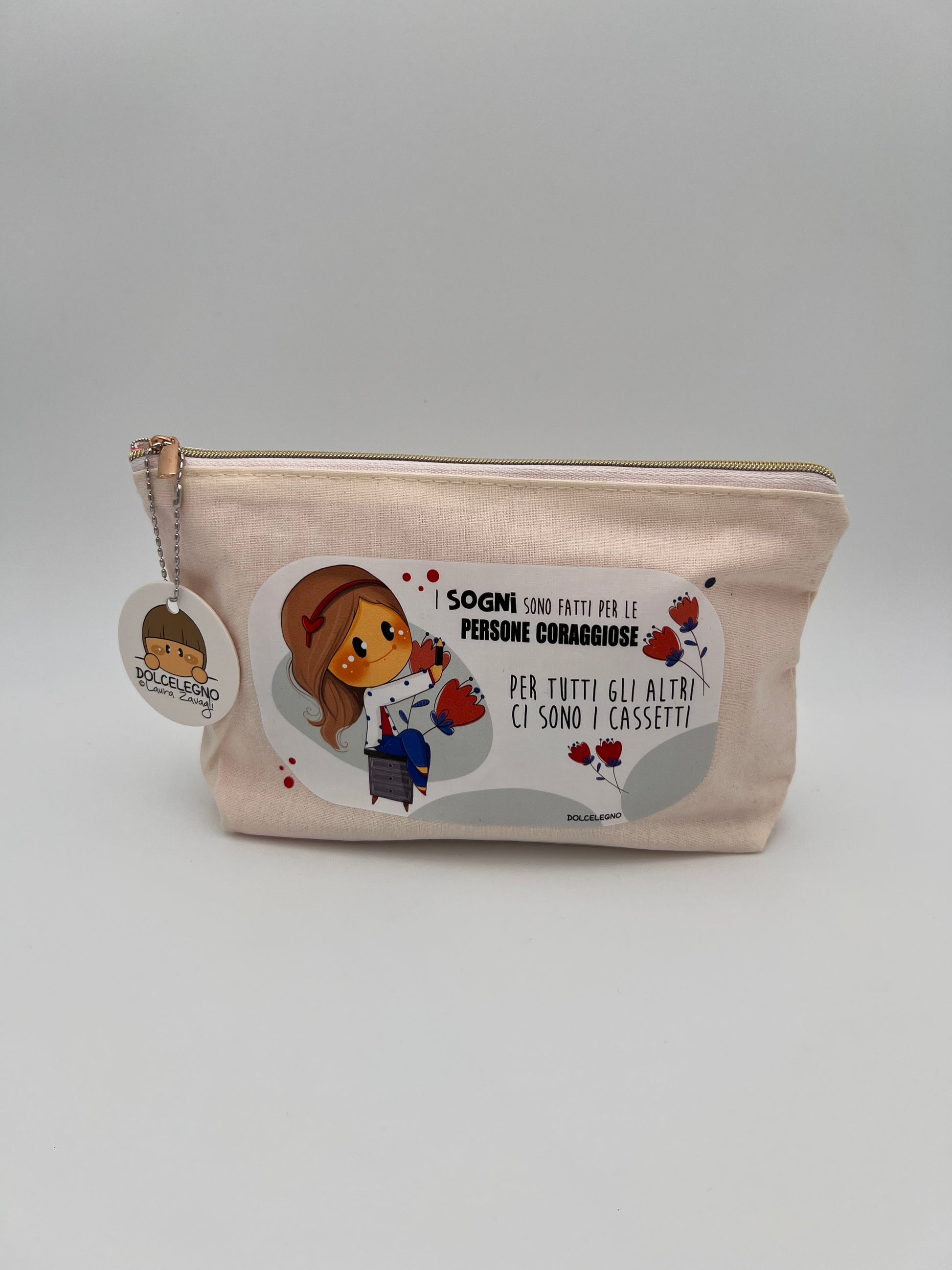 Bustina in tessuto delle Bubine con fodera interna a righe bianche e rosa.