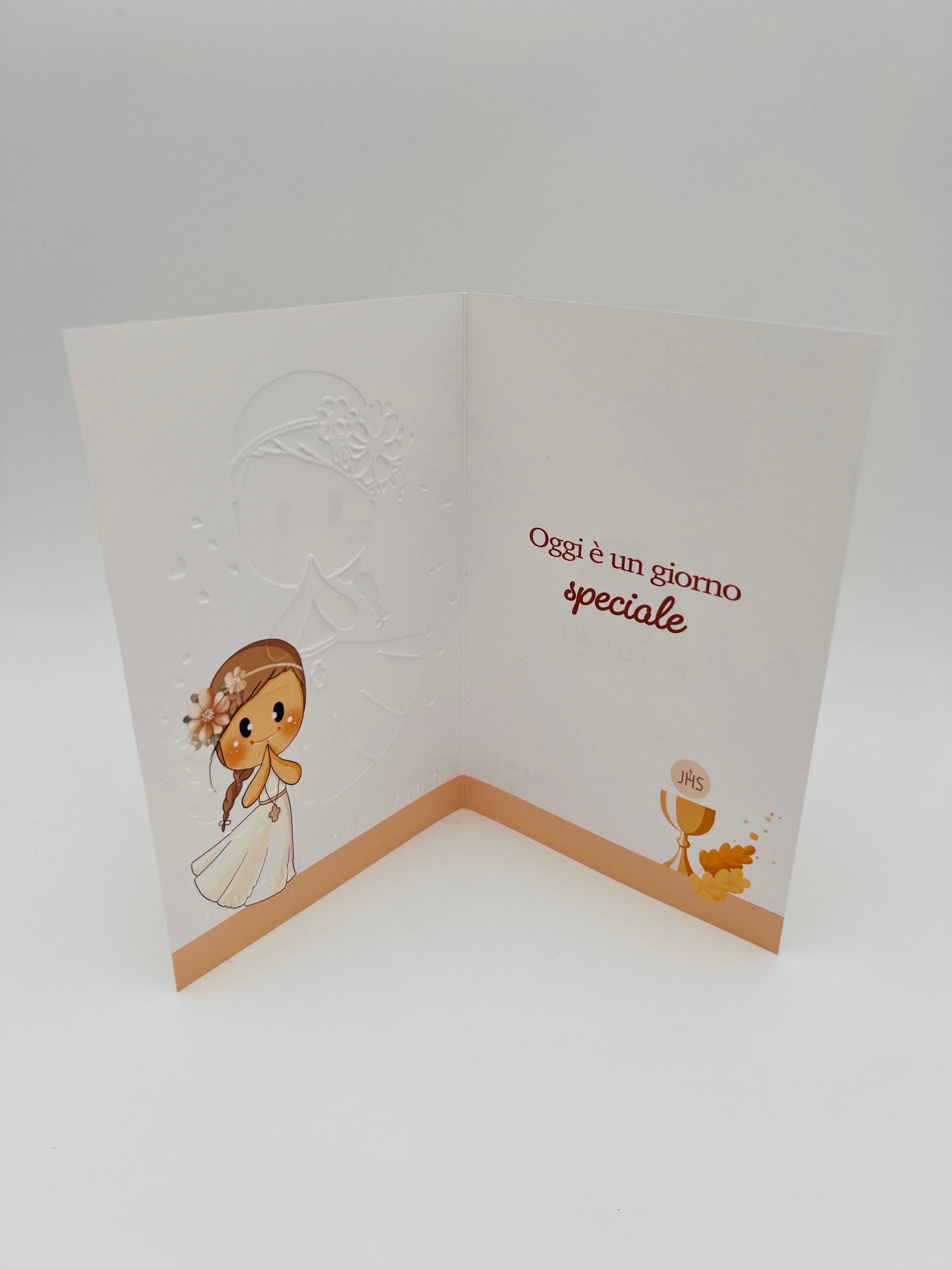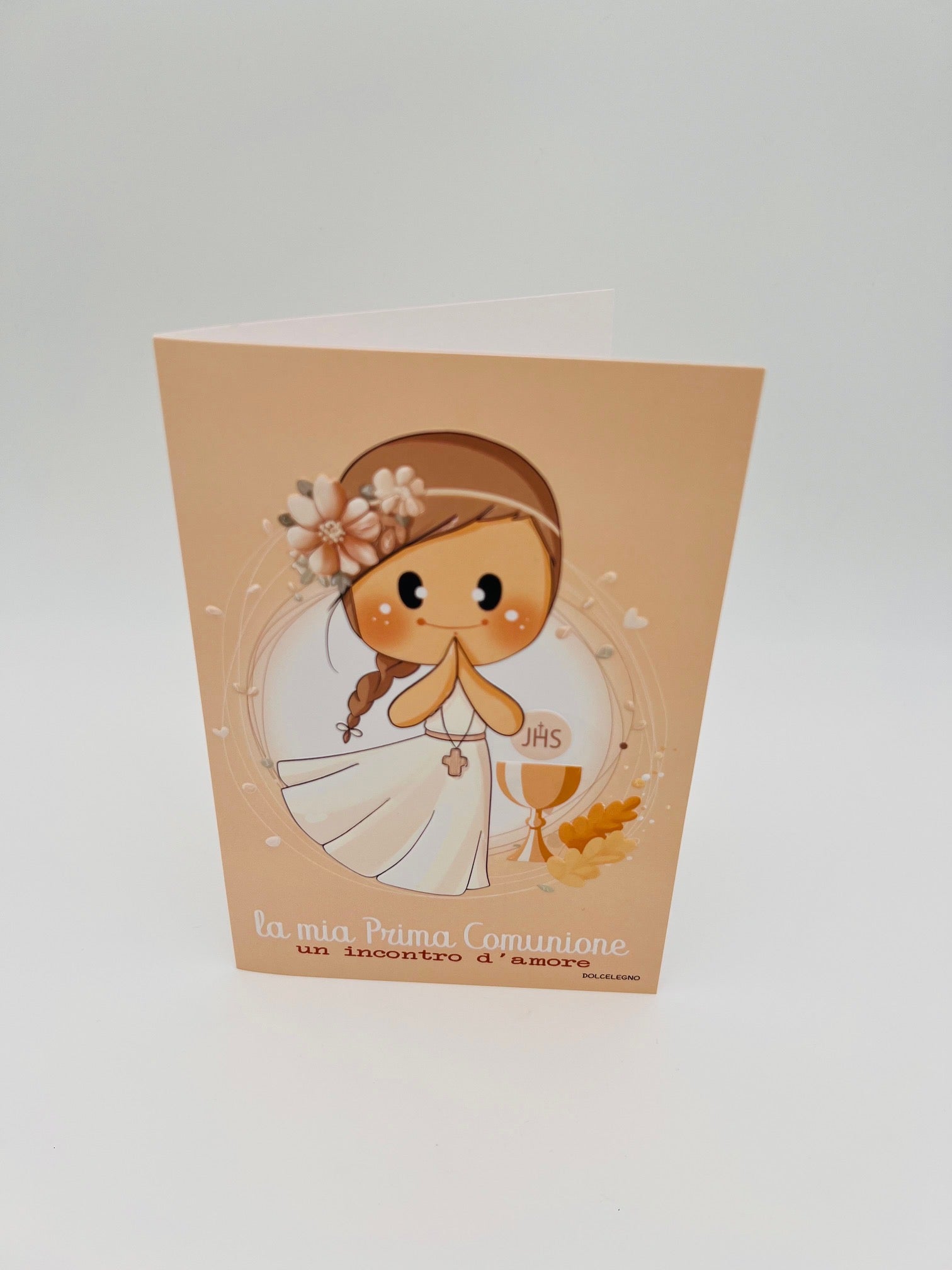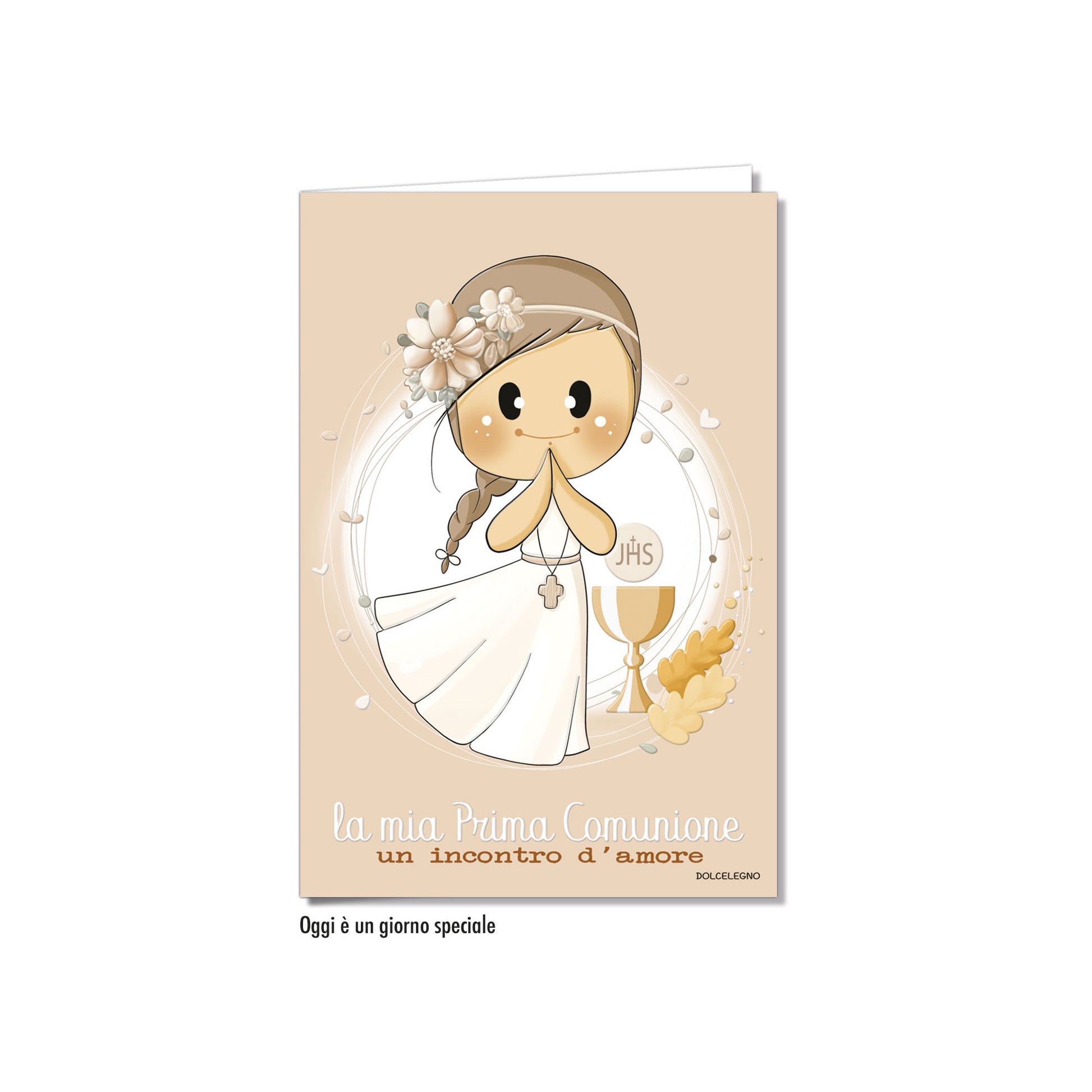 Biglietto d'auguri per festeggiare la Prima Comunione disegnato dall'artista Dolcelegno
