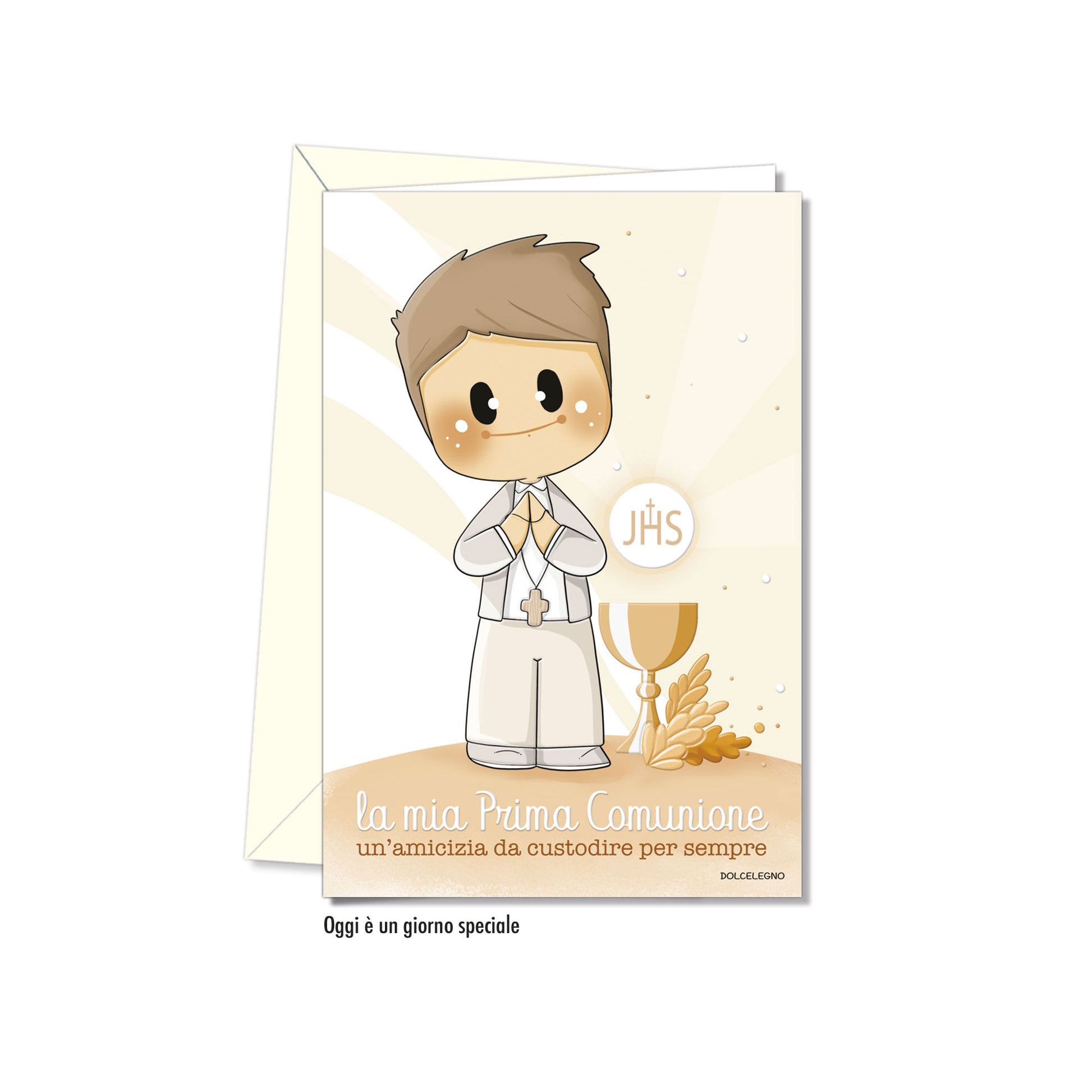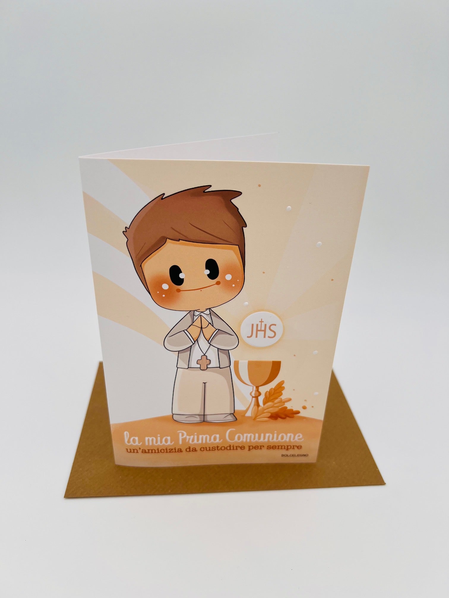 Biglietto d'auguri per festeggiare la Prima Comunione disegnato dall'artista Dolcelegno