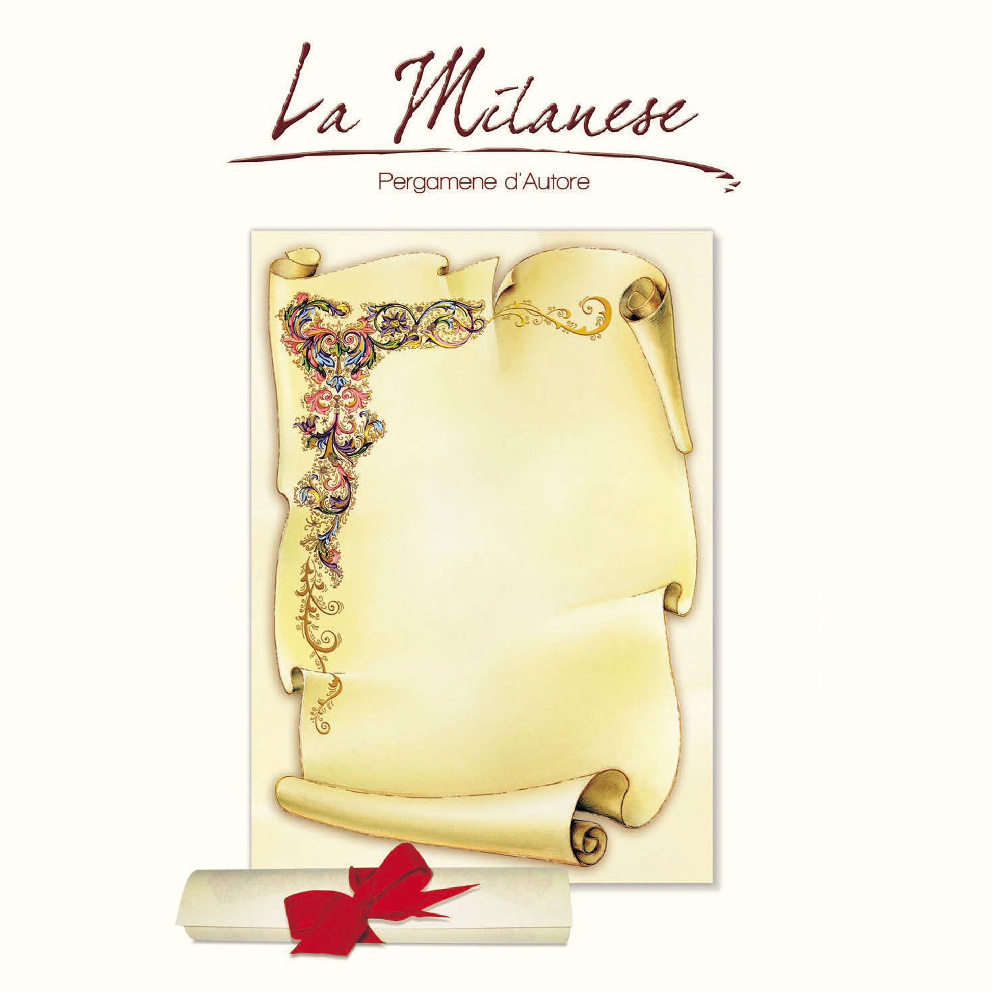 Diploma in carta pergamena avorio 160 gr con artistiche decorazioni in oro.
