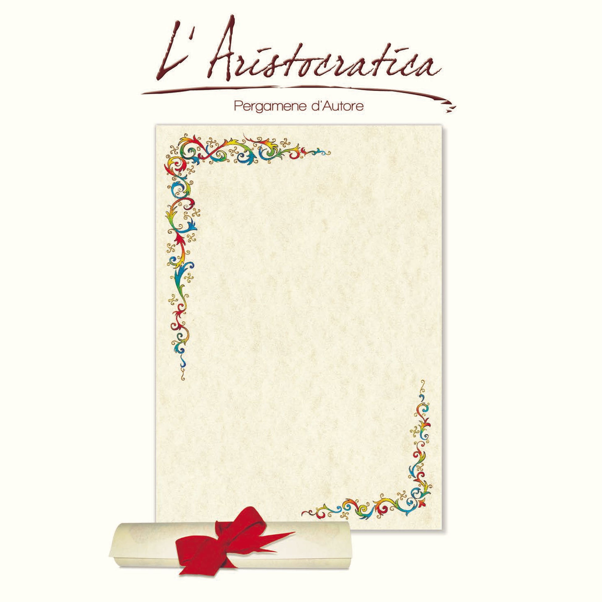 Diploma in carta pergamena avorio 160 gr con artistiche decorazioni in oro.